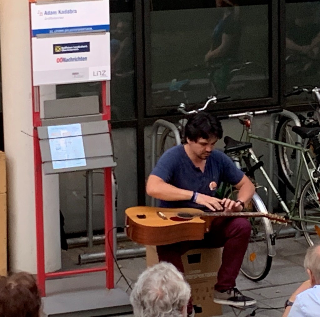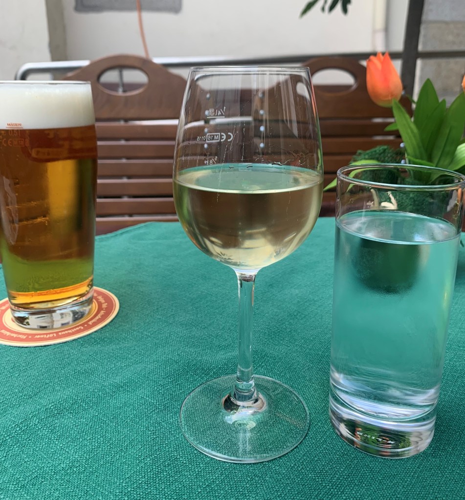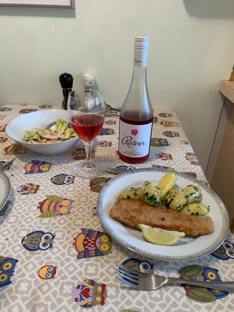 The Friday evening before we travelled to Nottingham for the weekend, we thought we would take a stroll along the Danube, which we call the Donau in Austria. We arranged to meet at the Nibelungenbrücke and discovered the streets closed to traffic and filled with people due to the annual Pflasterspektakel ,which translates as pavement spectacle and is an international festival of street performance art. We took our stroll and looked for somewhere to eat. On the way we stopped to listened to two performances, Faela, a Latin band whose members are from Argentina, England, Sweden and Spain, and Adam Kadabra who plays acoustic guitar using a lap-tapping technique. Both are worth looking out for in your local fringe festival. The evening was warm and the atmosphere was more lively than I expected to find in Austria. But we still hadn’t eaten and there were people teeming everywhere. We stumbled into Keintzel Wirtshaus im alten Rathaus, a tavern in the old townhall. This was brilliant because although it was full the turnaround was fast and they serve traditional Austrian food with no frills. It’s also cash only. Austria is a predominately cash society which can be a trap for the unwary. Apparently there is a high level of mistrust of cashless transactions, possibly because of data collection concerns. Cash is anonymous. We both ordered the Wiener Schnitzel and were not disappointed. Schnitzel is traditionally served with Petersilerdäpfel, (Petersilienkartoffeln in German), which are steamed potatoes tossed in parsley butter. It also came with a side salad dressed with the most perfectly vinegary Austrian dressing. I drank the classic Grüner Veltliner, which is a white grape variety grown primarily in Austria, Hungary, Slovakia and the Czech Republic. And of course a glass of wine is served with a glass of water which is very welcome on a hot evening. A wonderful introduction to Austrian cuisine.
