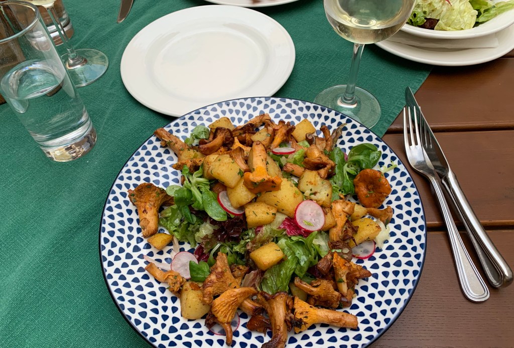 Friday was too hot to stand over a stove so we met up for a drink at the Café Traxlmayr which is a traditional Austrian bar/café. One of the attractions on this occasion was that if you sat outside the front of the café, every few minutes you were sprayed with a very fine mist of cool water – very handy when the temperature is in the 30s. These were fixed all along the front wall under the roof. We both enjoyed a Hugo. Have I mentioned this already? It is the most refreshing drink in the world. Combine Prosecco, soda, elderflower cordial and a lot of fresh mint. I am not sure of the ratios. The best ones are very minty. From there we revisited Keintzel Wirtshaus to sample the Eierschwammerl salad. It wasn’t nearly so frantic as the previous week and we had a very relaxed meal. We noticed there were a lot of large family groups and one family were playing cards.