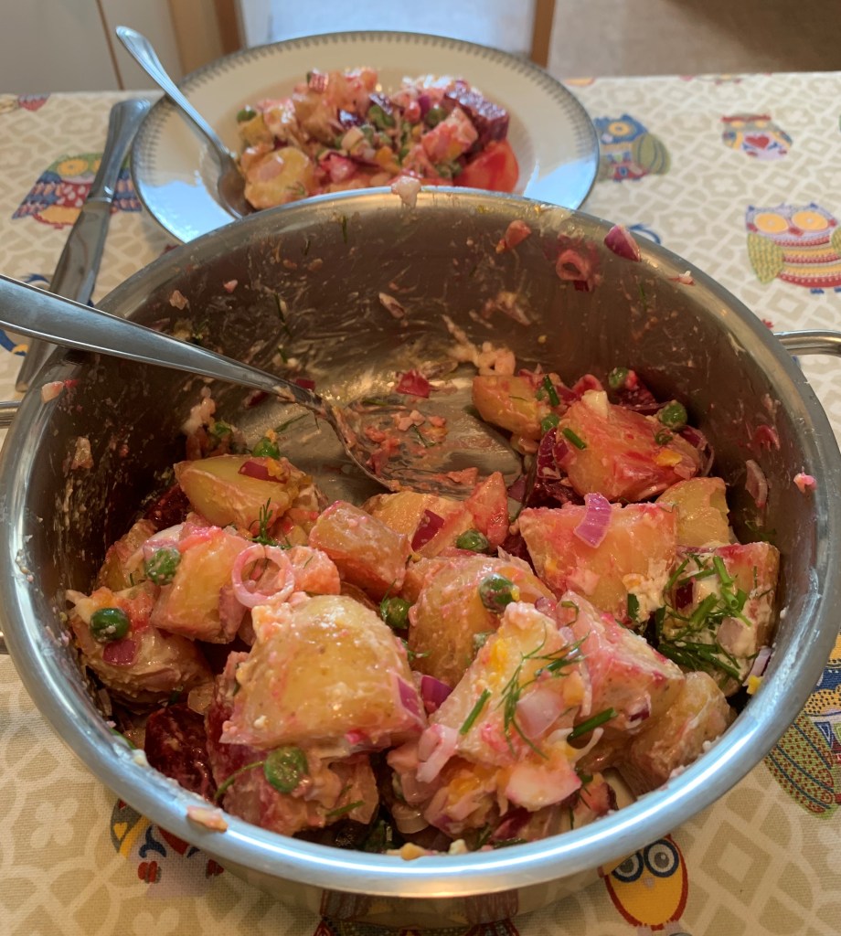 I’m pleased to report that on our return the beetroot and fennel had survived in the fridge. With the beetroot I made an Austrian-style version of a Salade Russe, if there is such a thing. Mix diced boiled potatoes with diced roasted beetroot, chopped spring onion, radishes, hard-boiled egg, chives and peas in a large mixing bowl. Make a dressing with 2 tbsp vinegar, 2 tsp Dijon mustard, 1/4 cup olive oil, 1/4 cup Greek yoghurt, salt & pepper to taste. Combine vegetables with dressing. I made all the dressing although it was more than I needed and I keep it in a jar in the fridge. It is lovely on a green salad.