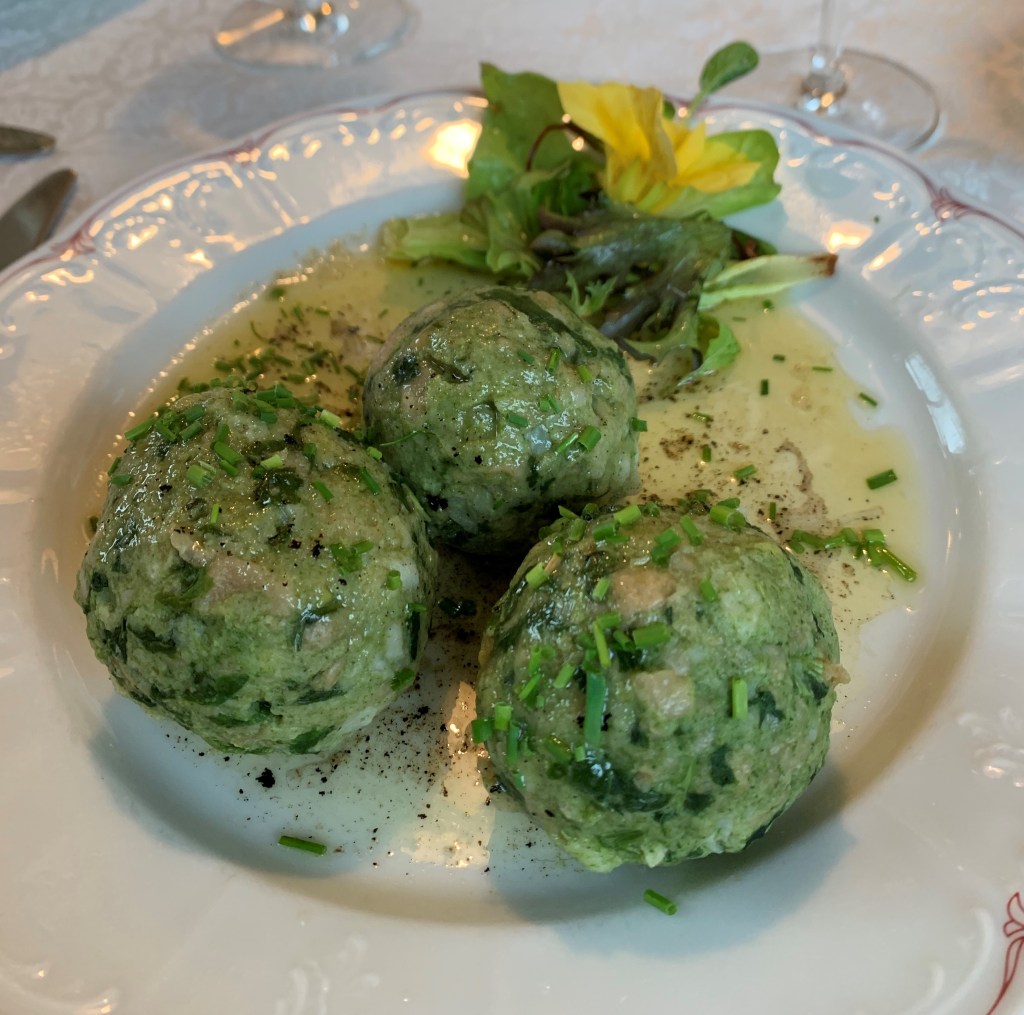One of the evenings at Faistenau was not steaming hot and Peter and I shared a bowl of soup. I had been keen to try the consommé with pancake stripes. Everywhere we eat there is a broth with pancake stripes on the menu. Yes – that is strips of pancake in the soup, not noodles. When I make this at home, I will think of it as pancake stripes. I also had goulash with semmelknödel. Austrian goulash is similar to Hungarian goulash but not the same. I assume that it has its heritage in the imperial Austria-Hungary. I love how food we associate with one country has connections with so many others. I always think of spätzle. I first had this in Würzburg where I was told it was a speciality of the town. Then everywhere we travelled after that right across to Strasbourg in France it appeared on every menu and was the speciality of that town. And it is served here as an Austrian dish. It would be interesting to group European regions by food specialisation rather than political boundaries. We might find more similarities than differences. In Austria goulash is served with semmelknödel which is a giant ball of bread. It is core to the culinary traditions of Austria, Bavaria, and the Czech Republic. It is stale bread mixed with flour, onion and herbs which is rolled into a large ball and boiled. It is also surprisingly delicious, if somewhat filling. It does a great job of soaking up the gravy from the goulash. I won’t be trying this one until I am at home in Wellington. Peter had the Tiroler Spinat Knödel which is basically the same thing finessed with spinach and Parmesan. Also delicious.