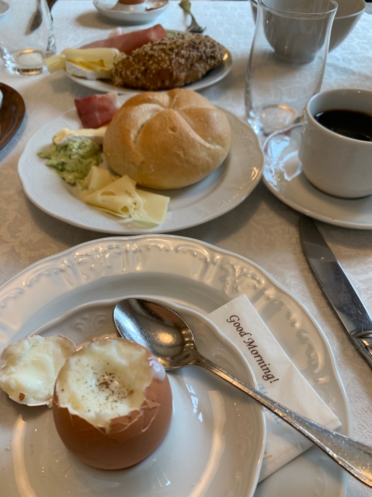 The best thing about Botenwirt among many great things was breakfast. Frühstück was served between the civilised hours of 8.00 a.m. and 9.30 so no rushing required. We ate in the dining room rather than outside and our table was set with a card with our name. We felt expected. Our host greeted us, offered coffee and asked if we wanted eggs. The soft boiled eggs were cooked to perfection and it was worth coming just for those. A sideboard was set up with all the options including a refrigerated bain-marie for the yoghurt and meat and cheese. Everything was local and organic and where practical home made. There was home-made elderflower cordial, basic muesli with fruit and delicious home-made yoghurt. There was meat and cheese and vegetables, and a delicious fresh cheese/ chives spread. There were all the bread rolls plus home-made jam and local honey. It was all fresh and delicious.