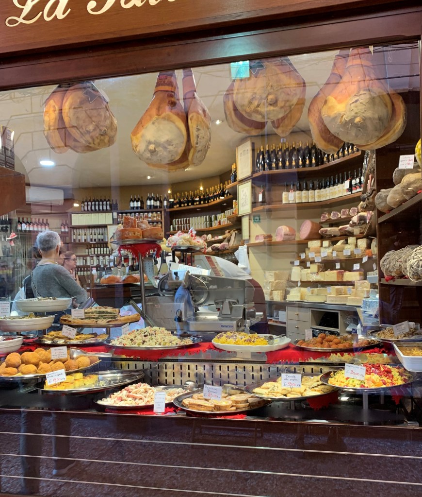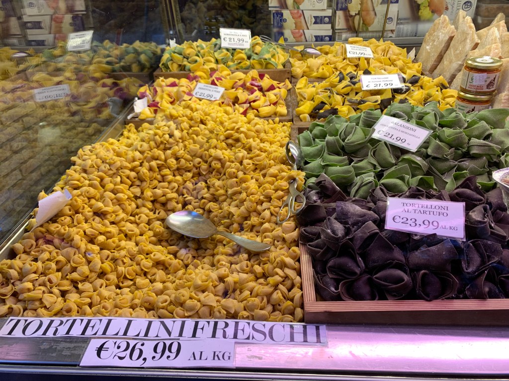 Here we are in Bologna, renowned for its food. The Italian classics we all know and probably have in our cupboards at home, Parmesan cheese, balsamic vinegar and prosciutto, hail from the region of Emilia-Romagna of which Bologna is the capital. The most famous Bologna dish is probably spaghetti Bolognese, which has the local Mayor in a rage. The traditional ragù alla Bolognese bears little resemblance to the soupy, tomato-heavy sauce we usually serve at home and is always served with tagliatelle, never spaghetti. However, the pasta dish Bologna is most renowned for is tortellini, which is a small ring-shaped pasta stuffed with meat and served in a broth. Tortelloni on the other hand is slightly larger, folded differently and is filled with ricotta and served with a sage and butter sauce. Do not confuse them.