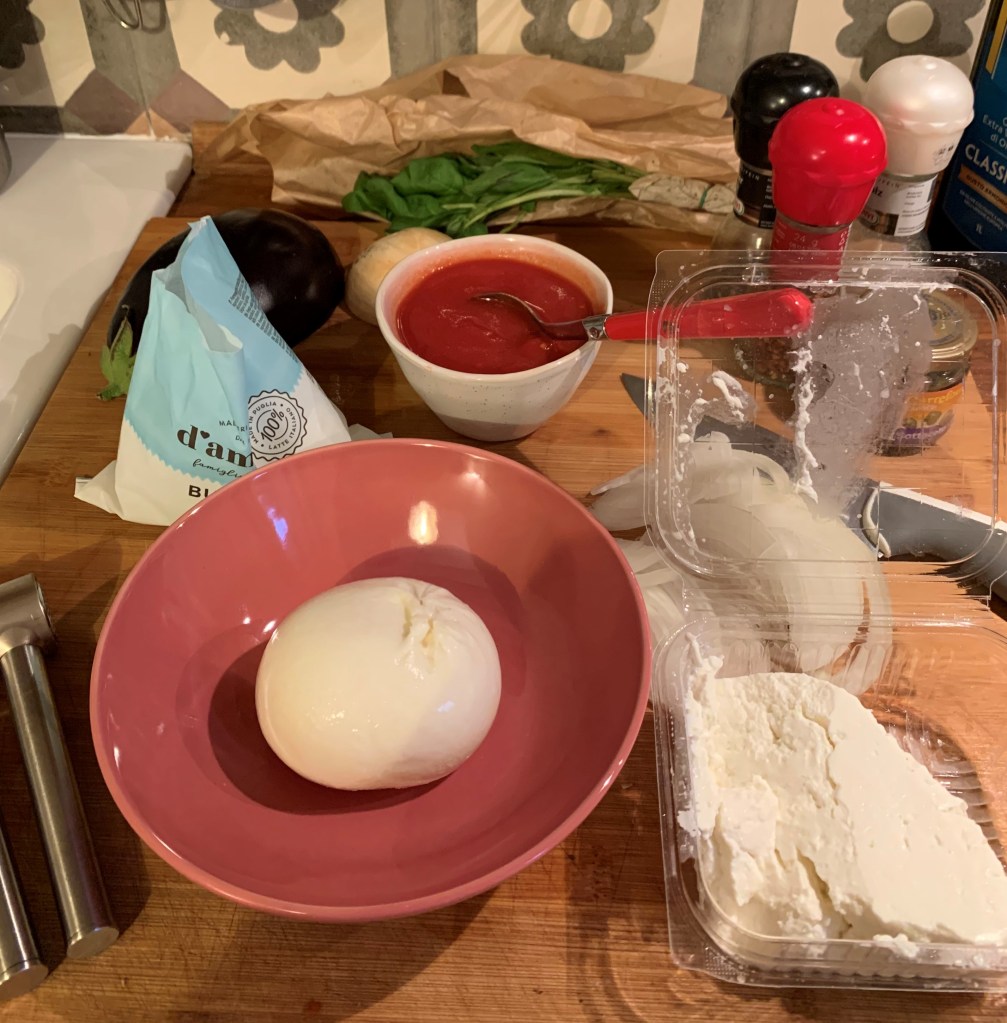 I am slowly mastering the fromaggeria. The Parmigiano is graded based on age and priced accordingly. I can choose cow’s milk ricotta, sheep milk, a mix of both, or goat. They have slightly different textures. There is a hard ricotta called ricotta salata which is delicious grated on soups and suchlike. I have also been introduced to burrata. Burrata is a fresh cow’s milk cheese from the Apulia region in the south. It is made from mozarella and cream. The outer shell is solid mozzarella, while the inside contains stracciatella and cream. Stracciatella, not to be confused with the Roman meat and egg soup of the same name, is produced using a stretching and shredding technique. I think they share the name because egg is added to hot soup producing a shredded effect. All of these cheeses have a role in the meal and you can use them all in the same meal at different stages of the cooking process.
