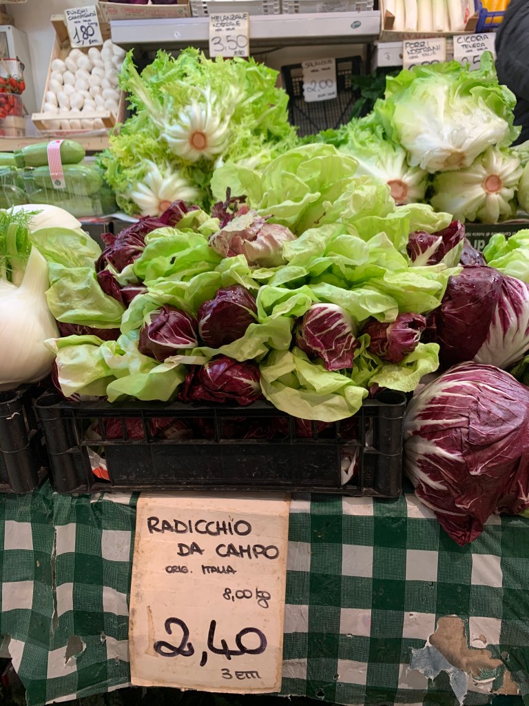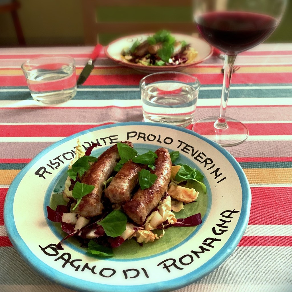 I have discovered delicious things to cook with Italian sausage. While the weather was still warm I served sausage with a radicchio salad. There are so many kinds of radicchio available in the markets here, most of which are unfamiliar to me. All of them are delicious. If you don’t like it because of the bitterness, try cooking it, which will render it sweet and delicious. I love it both raw and cooked. Like most Italian meals, there are few ingredients. You’ll need olive oil of course plus sausage, radicchio, lemon and basil. Cut your length of sausage into portions. Cut the radicchio lengthwise through the stem end and toss to coat with olive oil and a pinch of salt. Put the radicchio halves cut-side down in the pan with the sausages and cover. Cook for 2-3 minutes until the outer radicchio leaves are a dark brown, then set aside and finish cooking the sausages. Thinly slice the radicchio leaves. The outside leaves will be charred and the insides will be crisp and raw. Combine them in a bowl with olive oil and lemon juice and salt to taste. Spread them on the plate, top with sausage and garnish with basil leaves. Perfect for a warm summer evening. You could do this on a barbecue. Serve with some freshly baked Italian bread to mop up the juices.