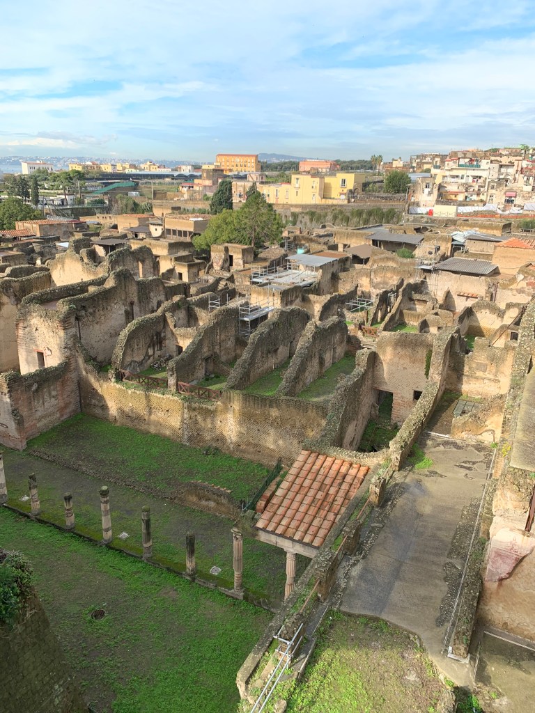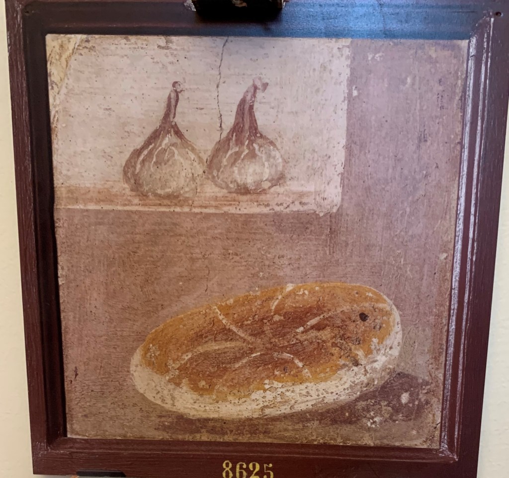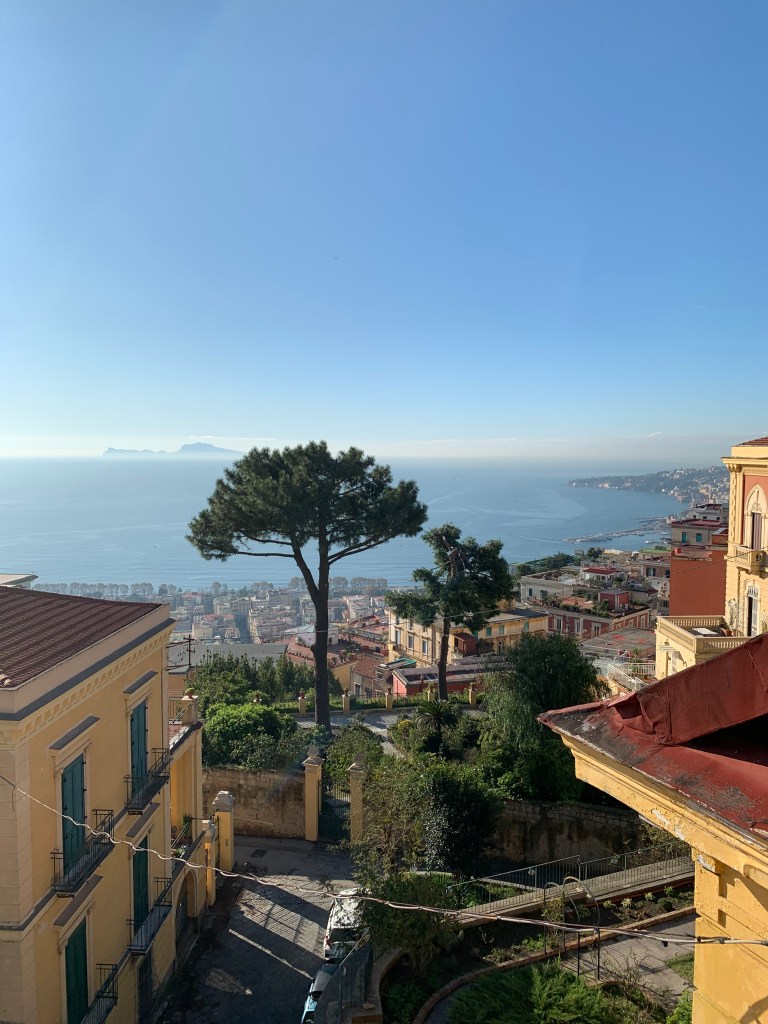 Napoli is the capital of Campania in southern Italy, and sits on the Bay of Naples. We decided to take a long weekend to visit the city of Napoli as well as nearby Pompei and Ercolano which were destroyed by the eruption of Mt Vesuvius in 79 CE. We stayed in a bed and breakfast in Vomero, which is situated on a hilltop and accessible via a funicular railway. From our room we looked across the bay or towards the Castel Sant’Elmo fortress. I hadn’t realised how much I miss hills and the sea until I saw them from our window. We travelled from the main shopping area of Vomero to our accommodation via two sets of escalators. This could be a good alternative to the Birdwood St steps in Karori. Apart from the view, the key feature of our accommodation was breakfast. As I have said Italians have coffee for colazione and maybe a pastry at the weekend. Our hostess presented us with a veritable feast every morning. When we arrived in the dining room looking out across the hills and the small orchard garden,the table was laden with slices of bread, meats and cheese, not to mention squacquerone and ricotta. As we settled down, we were presented with a plate of freshly made pancakes. Then scrambled eggs with cherry tomatoes. Next, she went through all the pastries and homemade items on the table. As well as two or three kinds of pastry there were homemade cakes, specialities of the region. I did my very best, however, on the last day, when I had eaten pancakes, scrambled eggs, a pastry and a slice of cake and was declining a slice of the second cake, our host looked me in the eye and said, “you don’t eat very much”. I felt I’d let the side down.