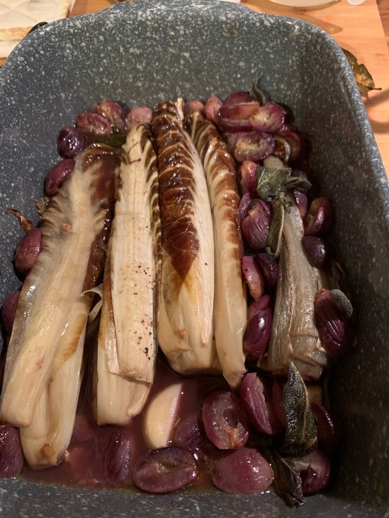 Start preparing the radicchio. Place two heads of radicchio in a roasting dish with clusters of seeded black grapes and 3 cloves of garlic, halved. I used radicchio rosso di treviso and rosso longo because I could, but you can use any radicchio you can find in your market, or perhaps your garden. Sprinkle with sage leaves and a tsp of fennel seeds. Drizzle with olive oil and 75ml grappa plus an equal amount of cold water. If you don’t have grappa use brandy. Put a knob of butter on the top and cover tightly with foil. Bake at 190 degrees for about 45 minutes.