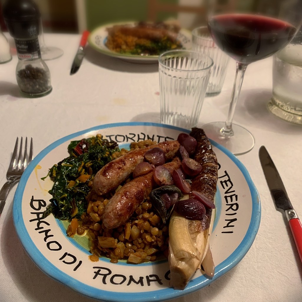 New Year in Italy involves fireworks and lentils. Fireworks I suspect because they are rumoroso and lentils because they resemble small coins and will bring good fortune to the home. We celebrated with friends over a meal of lentils, sausage, radicchio with grapes and creamy rainbow chard. I think you will want to make these dishes at home.