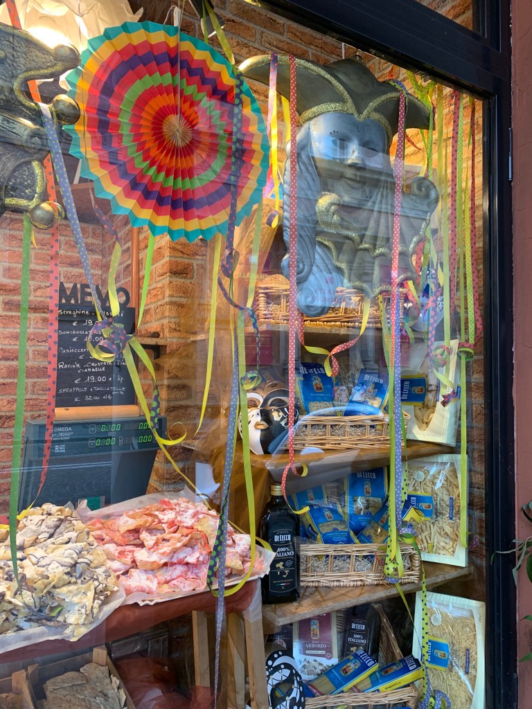 I was beginning to feel that we only had the short dark days ahead until spring. I went into my local panetteria this morning and I spied creations that defy description. I asked for my grissini and streghe, then I enquired, wide-eyed, “cosa sono questi”!? The panettiera explained that these are the sweet pastries typical in Bologna for Carnivale. I then noticed that the presepio in her window had been replaced by Carnivale decorations. I have a bag of these delights in my kitchen right now and winter will not defeat me after all.