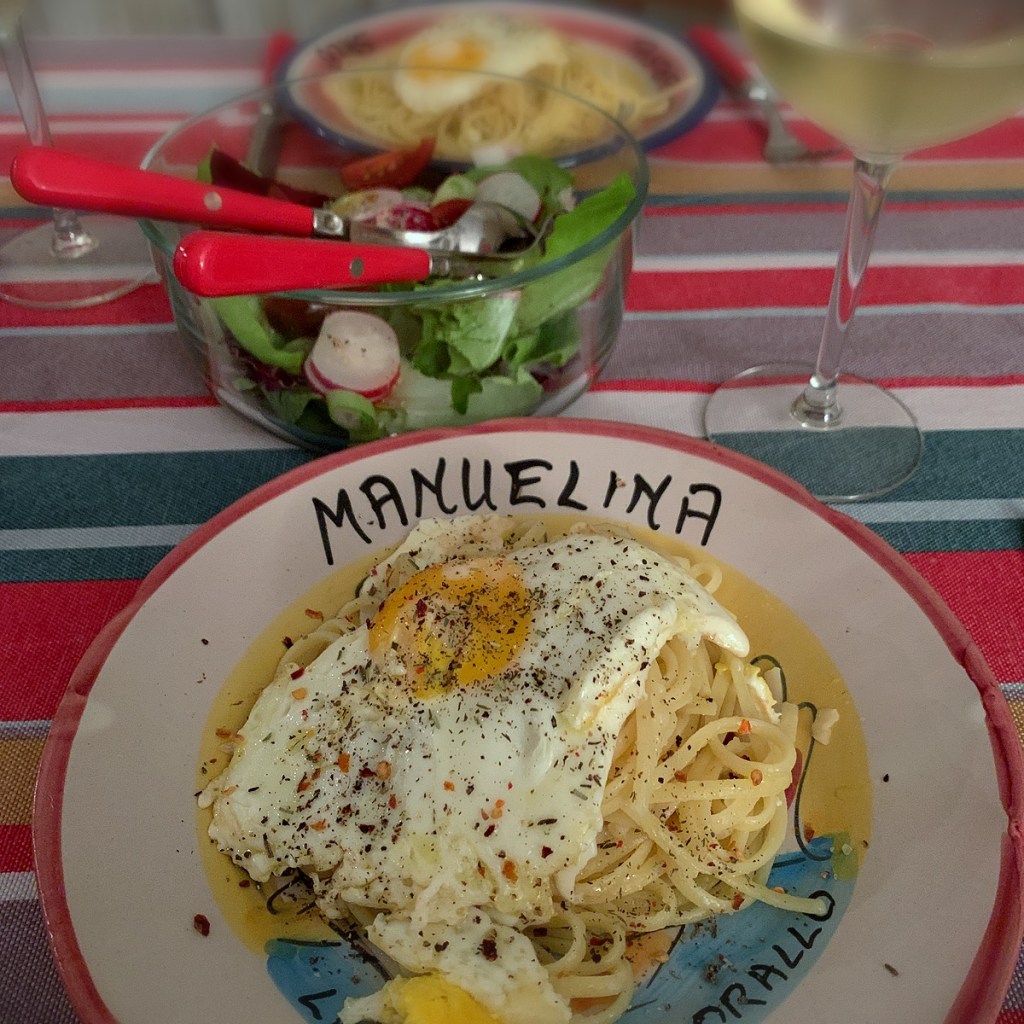I don’t cook spaghetti very much in Wellington but here in Bologna it feels like the right thing to eat and I have made some lovely simple spaghetti dishes. My top picks are carbonara, puverella, and spaghetti with chilli and olive oil. Carbonara is a dish from Rome. Saute pancetta in a pan, with a whole clove of garlic then remove the garlic. Or cook the pancetta in garlic infused oil. Add cooked spaghetti to the pan and remove from the heat. Pour in lightly beaten eggs and toss well adding some of the pasta cooking water to keep the sauce glossy. Mix in some Parmigiana and season with pepper. Puveralla was a dish I saw on a video in a food hall and I think it is from Naples. To prepare this, lightly fry eggs in a pan, allow 1.5 eggs per person. Take off the heat, remove one egg per person and set aside. Lightly whisk the remaining eggs and toss with the cooked spaghetti. Add some cooking water to loosen. Mix in some Parmigiana and season with pepper. Serve and top each plate with the set aside fried egg. This was such a comforting plate of food, I have named it eggy spaghetti. When we were in Venice I saw a woman eating a plate of just spaghetti. I looked on the menu as we were leaving and it was described as spaghetti aglio, olio e peperoncino. I made it that evening when we got back to Bologna. Heat garlic and chilli flakes in olive oil, taking care not to burn the garlic. Toss through the cooked spaghetti with some of the cooking water and add Parmigiana and chopped parsley. If you have stale bread you could grate to crumbs and lightly toast with the garlic and chilli. I am thinking of adding wilted greens if I happen to have something in the fridge that needs using. So now I am a spaghetti convert. The trick, as with all Italian cooking, is to keep the dishes very simple. A plate of spaghetti and a garden salad at the end of a busy day, is the perfect meal.