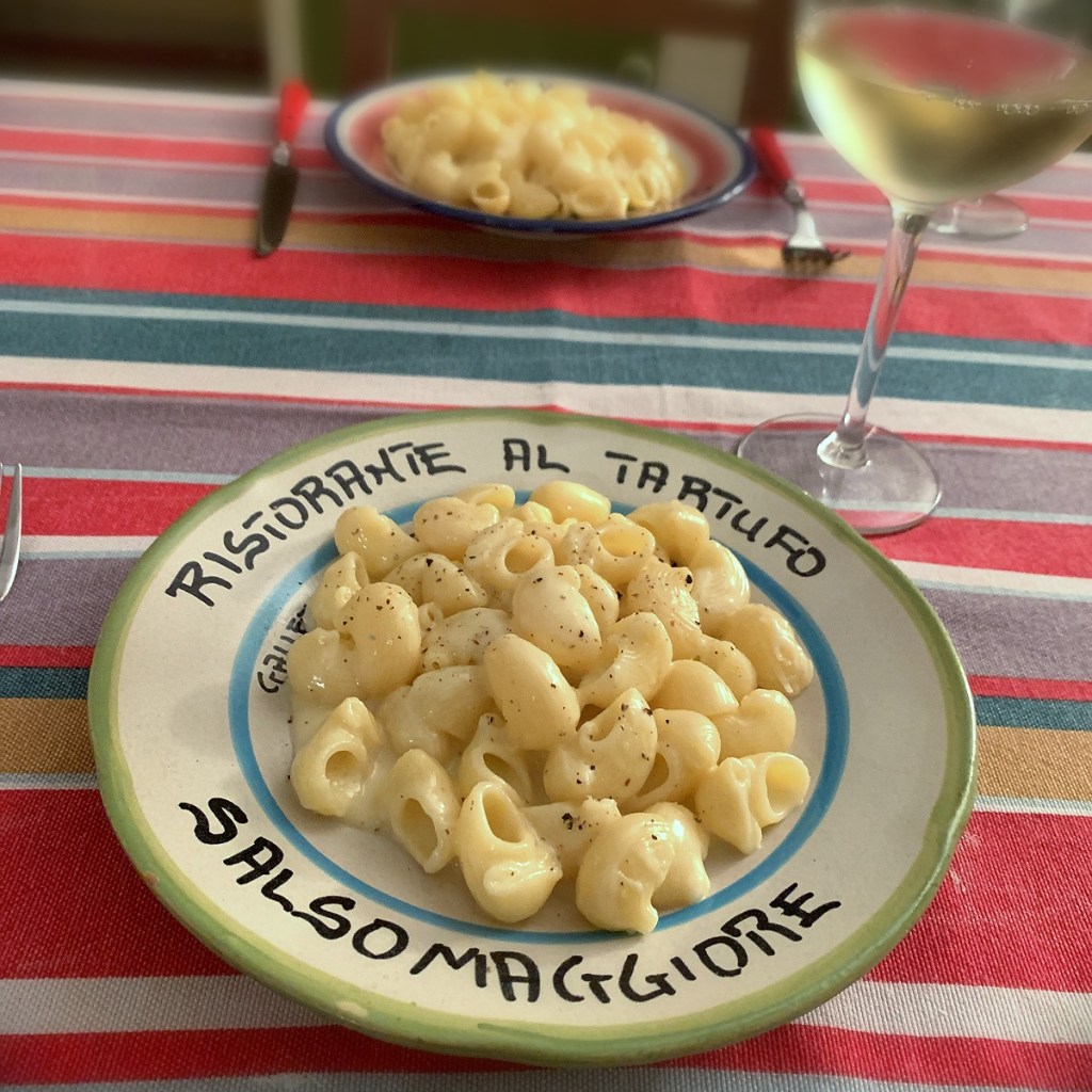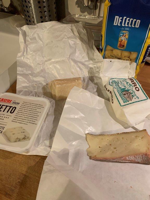 In Verona I was served pasta quattro formaggio and our host gave me her mother-in-law’s recipe. I made this at the earliest opportunity. You need four cheeses – gorgonzola and mascarpone (you can buy this pre-mixed in the supermarket in Italy), taleggio, Parmigiana, butter, and pasta. I was recommended to use pipe rigate which was an excellent choice. This is as simple as cook the pasta, melt the soft cheese with a little butter. Mix the drained pasta with the cheese. Add Parmigiana to get a consistency you like. Add a little cooking water to loosen the pasta if necessary. Season with black pepper. this is delicious and not as rich as it sounds.