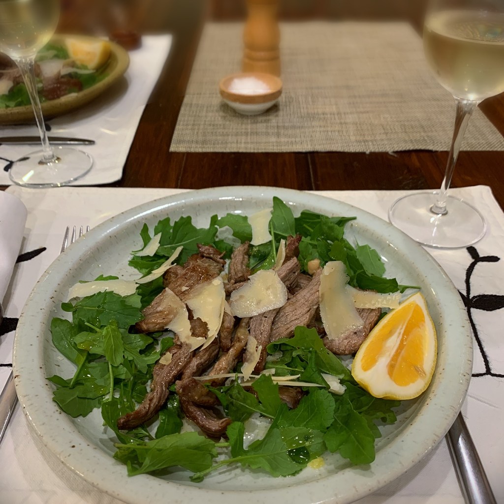 I keep turning to this book when I need inspiration. Straccetti di manzo con rughetta e Parmigiano. This is thinly sliced beef, stir fried in olive oil and served on a bed of rocket and shaved Parmesan, then dressed with the pan juices. Drizzle over more oil and serve with a wedge of lemon. Bill from Gipps St Butcher sliced our beef thinner than I could manage at home. Another keeper dish.