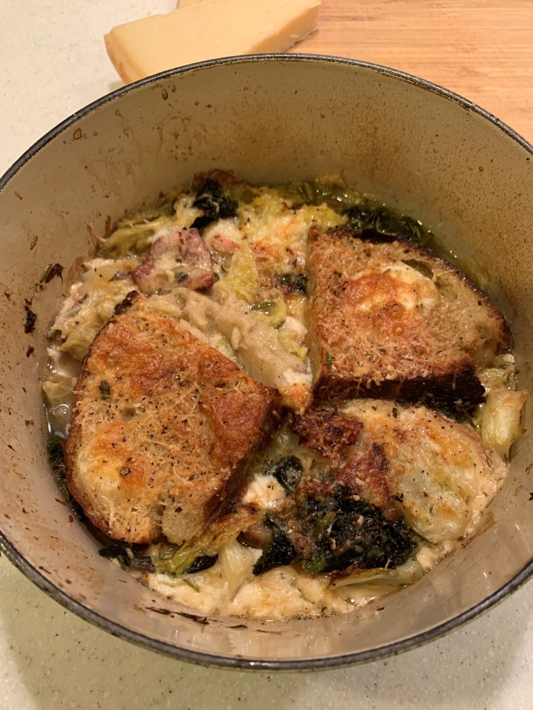 Everyone these days has a recipe for ribollita, and why not? It’s the best way to use up stale bread and the half a cabbage you have in the fridge. Jamie calls this one Italian bread and cabbage soup, p388. You’ll almost certainly adapt this recipe to what you have in the cupboard. And don’t buy fontina especially, although you should always have a good quality Parmigiana in the fridge. This was delicious but maybe a bit fiddly.