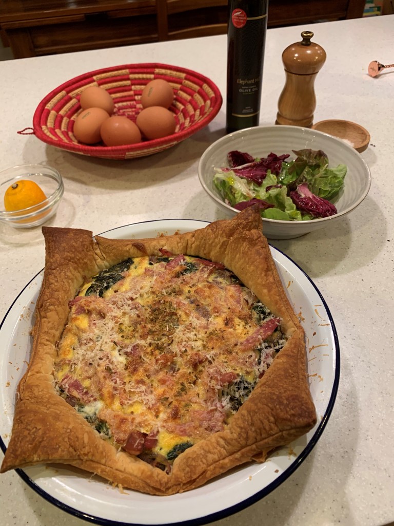 While I was away for the weekend, Peter got fancy with Jamie at Home and made ceviche, p376 and a ham and spinach tart, p347. I assumed he had followed the recipes to the letter, however he tinkered with both, swapping kingfish for tuna and chard for spinach. They both looked pretty good.