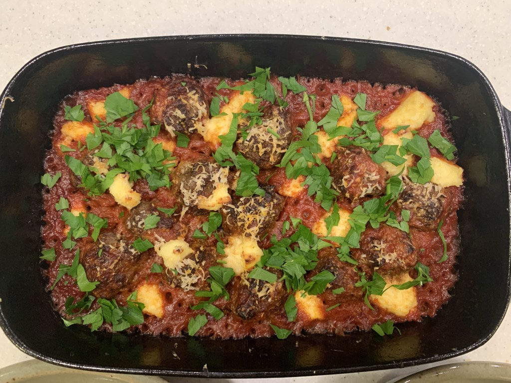 I bought the Naked Chef when the series first aired on TVNZ – in fact, it’s signed by the author when he visited Aotearoa to promote the book and series – and it has been a firm favourite ever since. There are so many family favourites in here. Roasted asparagus with cherry tomatoes, black olives and basil on p144, makes at least one appearance on our table every spring. I learned the basics of stock from this book and how to make a seafood risotto. It contains my go-to recipe for meatballs baked in tomato sauce on p133, and I always have some containers of the sauce in my freezer. I also happened to have some beef mince in the freezer that needed using, so I revisited the meatballs and, yes, they do not disappoint. For this exercise I am mostly using recipes I haven’t done before to see how they fit with our current eating habits.