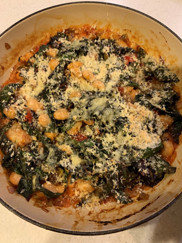 For two, simmer a tin of butter beans, with their liquid, in a pan to heat through. Add ½ dozen quartered cherry tomatoes, a knob of butter, a dash of white wine vinegar, tomato paste, a few drops of tabasco. Mash a few of the beans with a potato masher and simmer until the sauce has thickened. Add some shredded greens and wilt down. I always have chard in the garden but you could use spinach or cabbage. Cabbage will need a bit longer. I cooked this in a shallow oven-proof casserole and I sprinkled over some breadcrumbs and grated cheese and browned in the oven for 8-10 minutes. I also added chilli flakes to the beans at the beginning because chilli flakes enhance every dish. This recipe is a keeper.