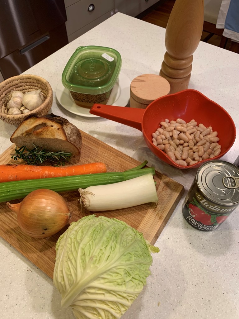 Hugh extols the virtues of root vegetables in this book. There is a five-root soup on p 272, roasted roots with mustard, rosemary and honey on p 318, sausage and root vegetable stew on p 217 and a three root mash on p308. This is very useful because if you buy the five root vegetables for the soup and there are only two of you, you will want another recipe or two to use up the remaining veg. This soup is absolutely delicious, and I recommend you try it. It was very soothing. I served the soup with the chopped vegetables in the broth, however there was a little left over which I pureed to freeze as I wasn’t sure the whole vegetables would thaw well.