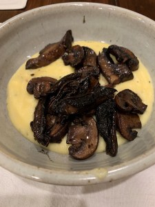 I wanted to make polenta chips when the little one came for supper. I know you can buy ready cooked polenta these days, but I like to cook a large batch of polenta from scratch and set some aside to make polenta chips another day. I made the mushroom ragout with soft polenta on p57. Hugh uses instant polenta and I always use the coarser slow cook polenta that takes a bit longer and sometimes means some adjusting to the recipes. I use a ratio of 1:4, using 1.5 cups polenta for four people and 6 cups of water or chicken or vegetable stock. I pour the polenta slowly into the boiling liquid stirring constantly, turn down to the lowest heat, cover and simmer about 40 minutes, stirring occasionally. The timing is approximate. I just keep cooking it until the texture is velvety smooth. I add Parmesan and season at the end. For the mushroom ragout, Hugh used the same recipe as in the risoniotto, substituting red wine for the balsamic vinegar. I would use either variation of this basic mushroom sauce as a go-to recipe. Later in the week I used the left-over polenta to make polenta chips with tomato sauce from p58.