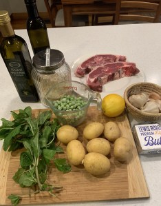 I started with Grilled Barnsley chops w crushed peas and mint sauce. I love the sound of a Barnsley chop which is a double loin lamb chop. This was barely a recipe. The chops were coated with oil, garlic, rosemary and lemon zest, chargrilled in a pan and finished in a medium oven. The peas were cooked and lightly crushed with butter and lemon zest. The mint sauce is the classic my mother used to make, mint, sugar, vinegar, and I served it in the jug my mother always used for mint sauce. I served them with roasted potatoes, because roasted potatoes belong on most plates.