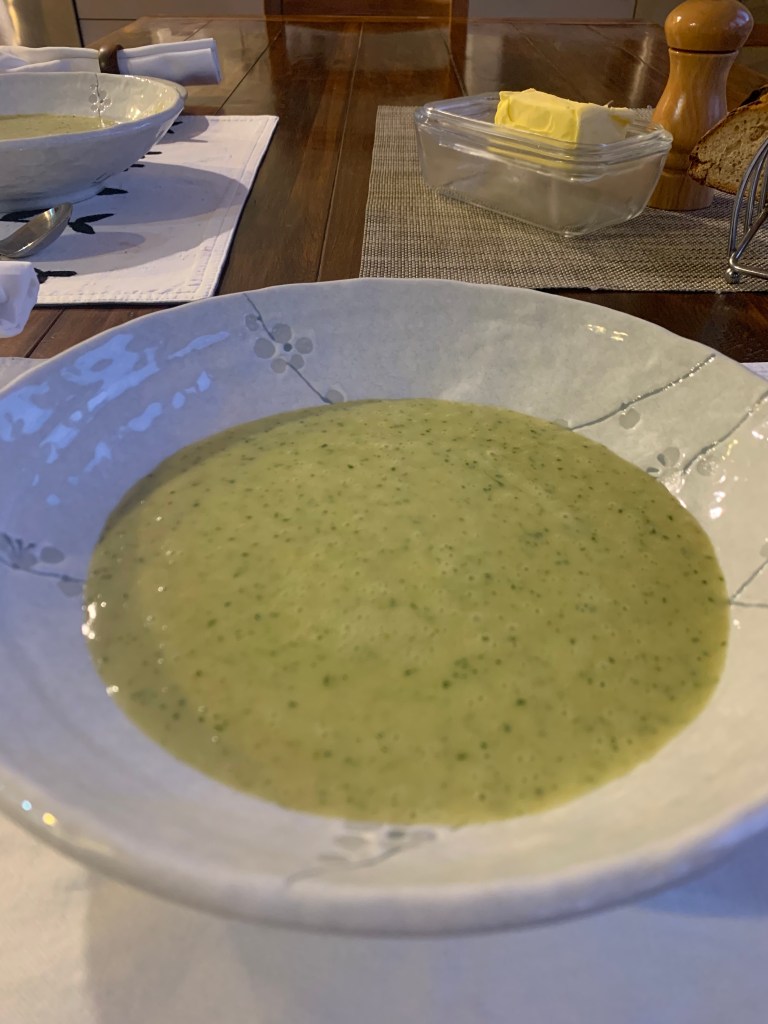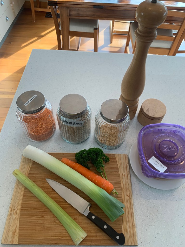 On soup Monday, we enjoyed the leek, carrot and pearl barley soup w peas and lentils, p35. For four, simmer a litre of chicken stock with 75g of a mix of pearl barley, red lentils, yellow and green split peas, 30 minutes until the pulses are almost soft. You could buy a packet of “soup mix”.