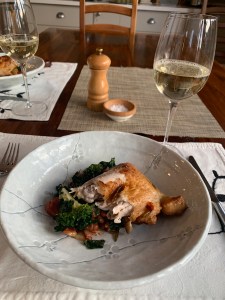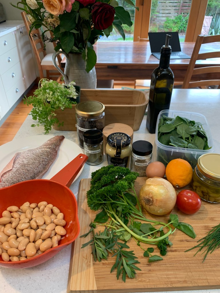 This book has a lot of meat recipes and recipes for game and fish we don’t get here. I tried hake w sauce verte and butter beans, p57. I couldn’t get hake, so I bought snapper with skin on as suggested. There are quite a few steps to this recipe, but it’s not really complicated especially if you break it down into sections. I would have soaked and cooked the butterbeans however dried beans are really hard to get at the moment so I opened a tin, rinsed and set them aside to drain.