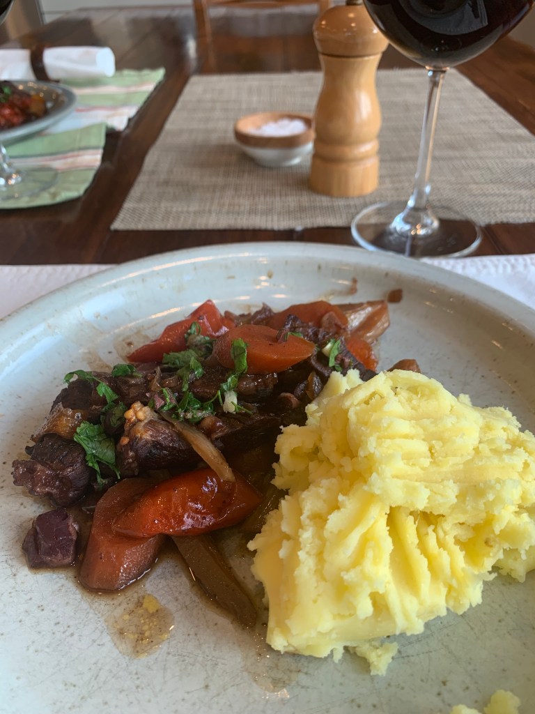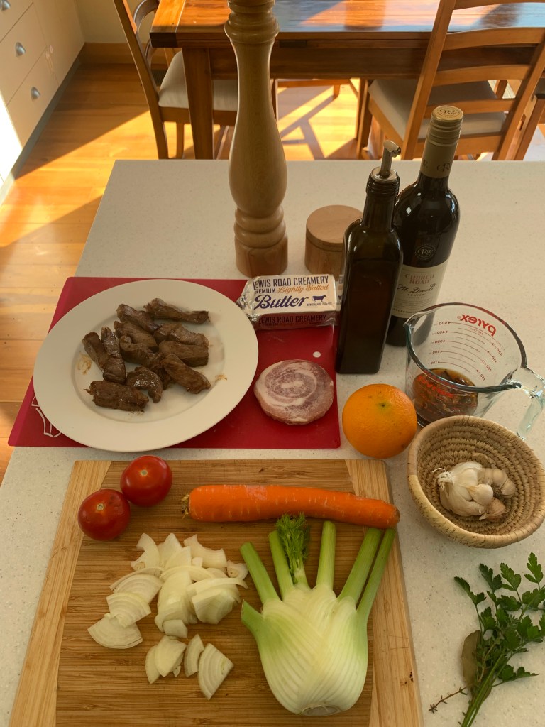 Before we moved on, we made la daube de boeuf Provençale, p116. This is a beef stew with a French name, possibly of a style often served in Provence.