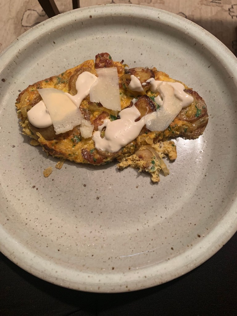 On omelette night we made chorizo Manchego tortilla p119. This uses chat potatoes which I’ve never heard of, but which are apparently just very small potatoes, probably waxy are best. I love to make a tortilla to use up things in the fridge for a Friday night supper or Saturday lunch and this is a pretty good version. Eggs, potatoes, chorizo, sherry. Nothing more need be said.