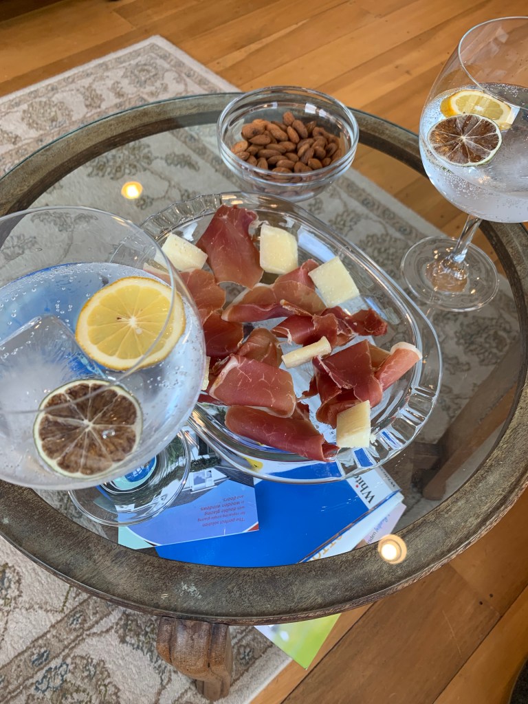 I was going to stop there but I have been inspired by Spain and I kept going. We had clams with cider and chorizo, p48. No sherry this time but chorizo and cider. I learned a few years ago that in the late 1980s gin and tonic became a popular drink in Spain, particularly in the Basque region. This is known as gin tonica and served in a large balloon shaped glass with large ice cubes (keeps the drink cold without melting into the gin) and an aromatic garnish. It seemed only right to have a gin tonica for our aperitivo with jamón and Spanish roasted almonds.