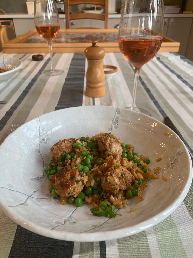 Next I was inspired by the delightfully named albóndigas with rice and flat beans, also p48. Not quite the season for flat beans so I added frozen peas which worked a treat. Albóndigas is just Spanish for meatballs but a much more delicious sounding word. Sherry but no chorizo in this one. And again the issue of the hard to find calasparra. Arborio sufficed again.