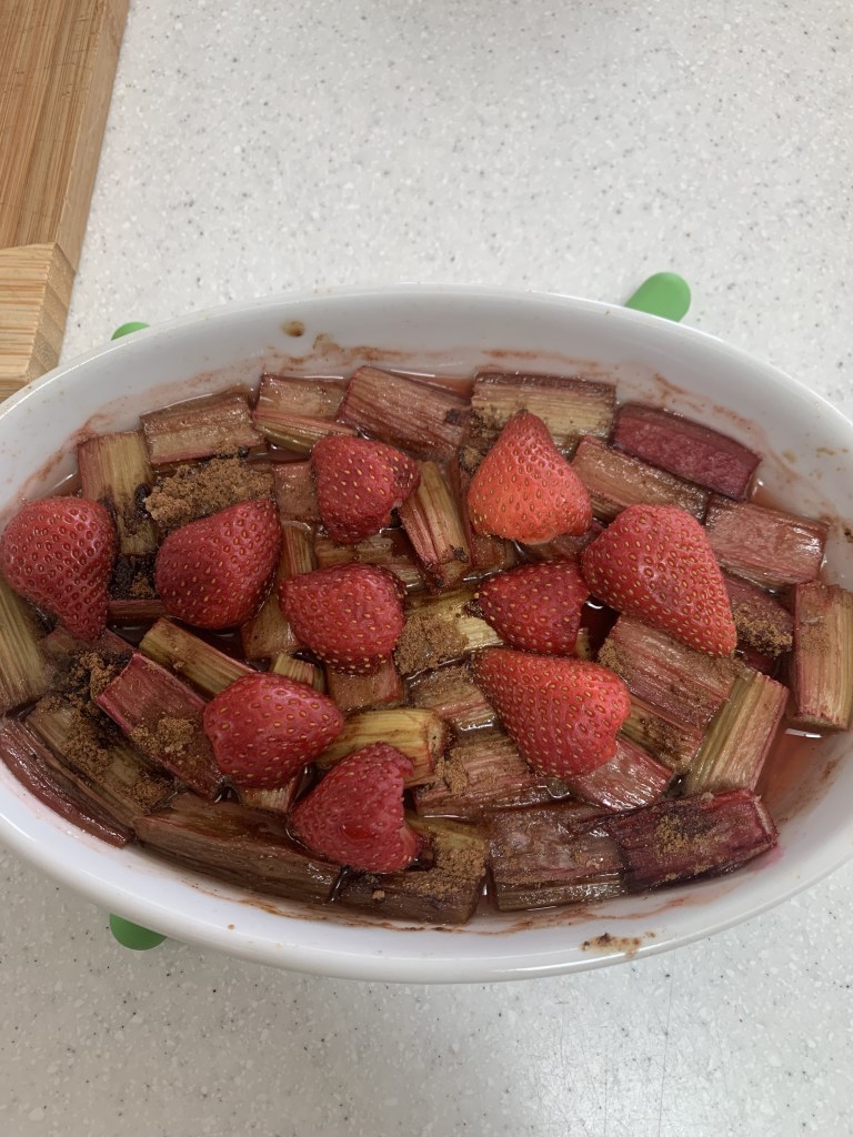 For breakfast, I make two compotes. For the first, cut about 8 stalks of rhubarb into 6 cm pieces and lay in a small baking dish. Finely grate the zest of half an orange over the rhubarb and then squeeze the juice of the whole orange into the dish. Split a vanilla bean, scrape out the seeds and put both in with the rhubarb. Drizzle over 1-2 tbsp honey or sprinkle a little brown sugar. I sometimes add strawberries. Bake at 175C for 15 to 20 minutes. This is delicious with muesli, on its own, stirred through yoghurt or whipped cream, or both.