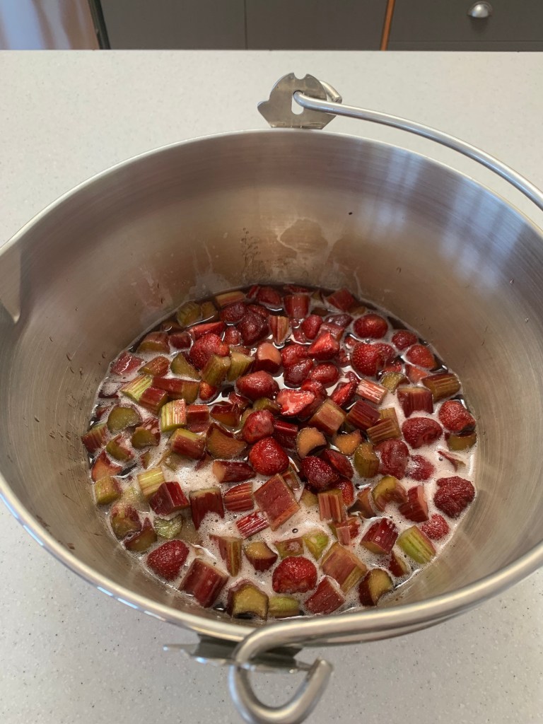 My current favourite is rhubarb and strawberry spoon jam. Hull 700g strawberries and trim 900g rhubarb. Cut everything into similar sized pieces and put them into a large bowl. Add a kg sugar, cover and leave on the bench overnight. In the morning, prepare about 6 jam jars. Wash, rinse and dry in the oven. Put a couple of small saucers in the freezer for testing the jam.