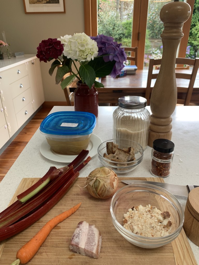 I found a recipe for rhubarb soup in Jane Grigson’s Fruit Book. She had found it in Ruth Lowinsky’s Lovely Food (1931) as part of a menu for a “dinner to impress your publisher and make him offer ridiculous sums for the privilege of printing your next book”. Mrs Lowinsky had acquired it from Dr William Kitchiner’s Cook’s Oracle (1817) and who knows where he sourced it. The original recipe was for ten and I scaled it down for two. Roughly chop 125 g rhubarb and sauté in butter with half a sliced onion, half a small carrot, diced, half a slice of chopped lean ham. Simmer gently until the rhubarb is tender. Then, add 2-3 cups of good chicken or vegetable stock and 30g fresh breadcrumbs. Simmer about fifteen minutes, skim off any fat, season with salt and pepper and a pinch of cayenne. The recipe said to pass through a sieve, so I whizzed it up with the stick blender. Serve with croutons. I was very apprehensive about this soup, however I can assure you that if you have a publisher to impress, this will do the trick and I will definitely be making it again.