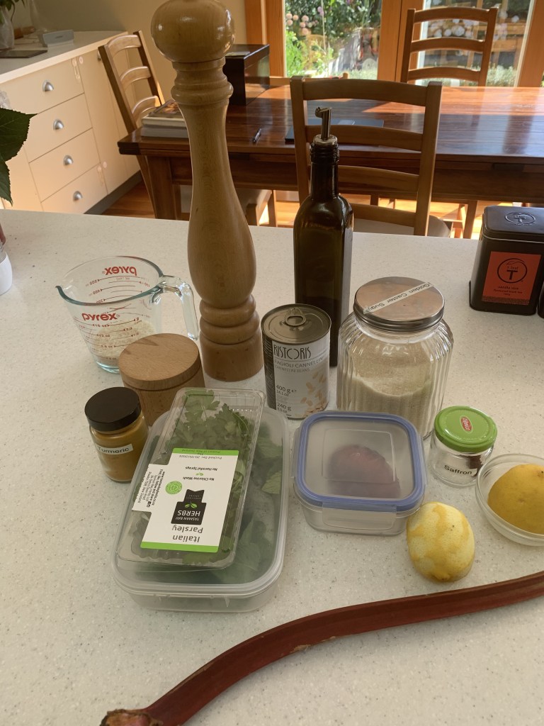 In a Dutch oven, sauté a finely chopped onion in olive oil, sprinkle with salt and reduce the heat. Add ¼ tsp turmeric and cook about 30 seconds. Add the equivalent of two tins of cooked cannellini beans, season and cook gently about five minutes. Add the herb mixture with a cup of water and a pinch of saffron that has been steeped in a tbsp warm water. Keep the herb pan handy. Cover and simmer for ½ an hour. Add 2 tbsp lemon juice and simmer another fifteen minutes. Season to taste. Add more water as you go if necessary.
