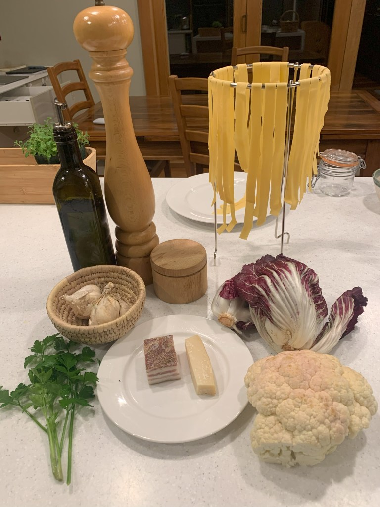 We started on p78 with cauliflower, radicchio, pancetta and Parmesan fettucine. We made pasta and settled on pappardelle because I thought the width was more robust with the cauliflower. Cut the cauliflower into small florets, blanch for a couple of minutes and refresh. Sauté the pancetta and once it begins to crisp and render some of the fat, add the cauliflower until they begin to colour. Turn down the heat and add the garlic, cooking for 30 seconds. Then add the cooked pasta with a little olive oil and season. Toss through chopped parsley and Parmesan with a little extra cheese when serving. The recipe didn’t say what to do with the radicchio, so I shredded a handful of leaves and added them after the garlic and before the pasta. I also added some chilli flakes with the cauliflower. This was delicious.