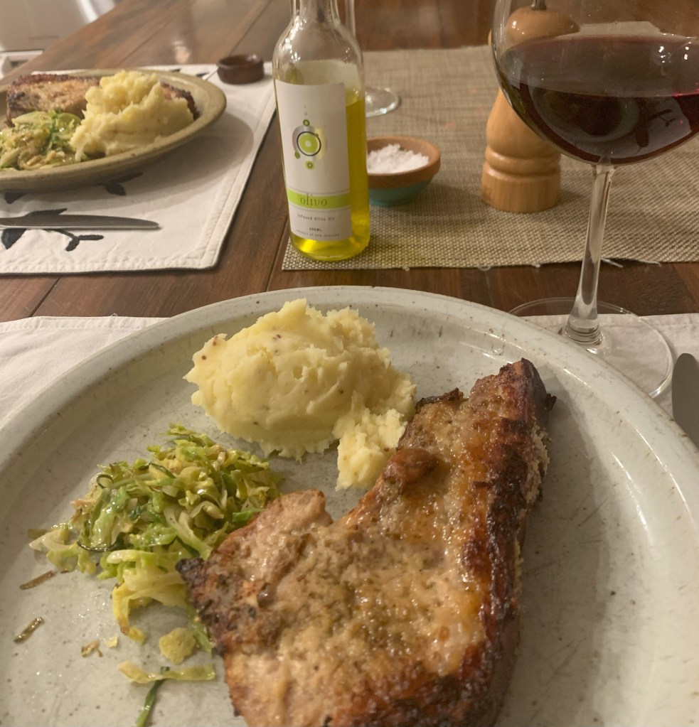 When you’re ready to cook, dip the pork in milk then breadcrumbs, either fresh or panko. This is where we went wrong. The recipe said to put the chops in a heated roasting dish, cover tightly with foil and bake in the oven at 180° for an hour, turning once. The crumbs were soggy. It was a great idea, but I’d do it differently next time.