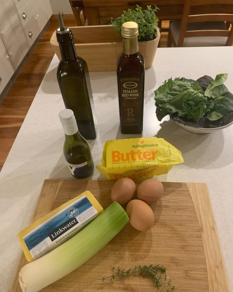 On omelette night I made the melted leek, thyme and Gruyere frittata on p84. The method for melting the leeks is a winner. Finely chop a washed leek. Very gently melt 50g butter and a tsp fresh thyme leaves in a saucepan and add the leeks. Cook, covered, very gently for five minutes. Add ½ cup of white wine and continue cooking covered until the wine has disappeared. This will take about 20 minutes and your leeks will be deliciously sweet and unctuous. Season and add more fresh thyme leaves. Mix the eggs with grated cheese and salt and pepper. I find three eggs is sufficient for two people. Now the recipe says to heat the leeks in the pan you are using to make the frittata but I usually put my cooked filling in with the eggs and then tip everything into the frittata pan. This seems to prevent the egg sticking and I never use a non-stick pan. Cook until set. I usually finish in the oven but I put the lid on which also worked. This frittata was perfect. And this is now my go-to method for cooking leeks. I served this as suggested with bitter leaves dressed with sherry vinegar and olive oil.