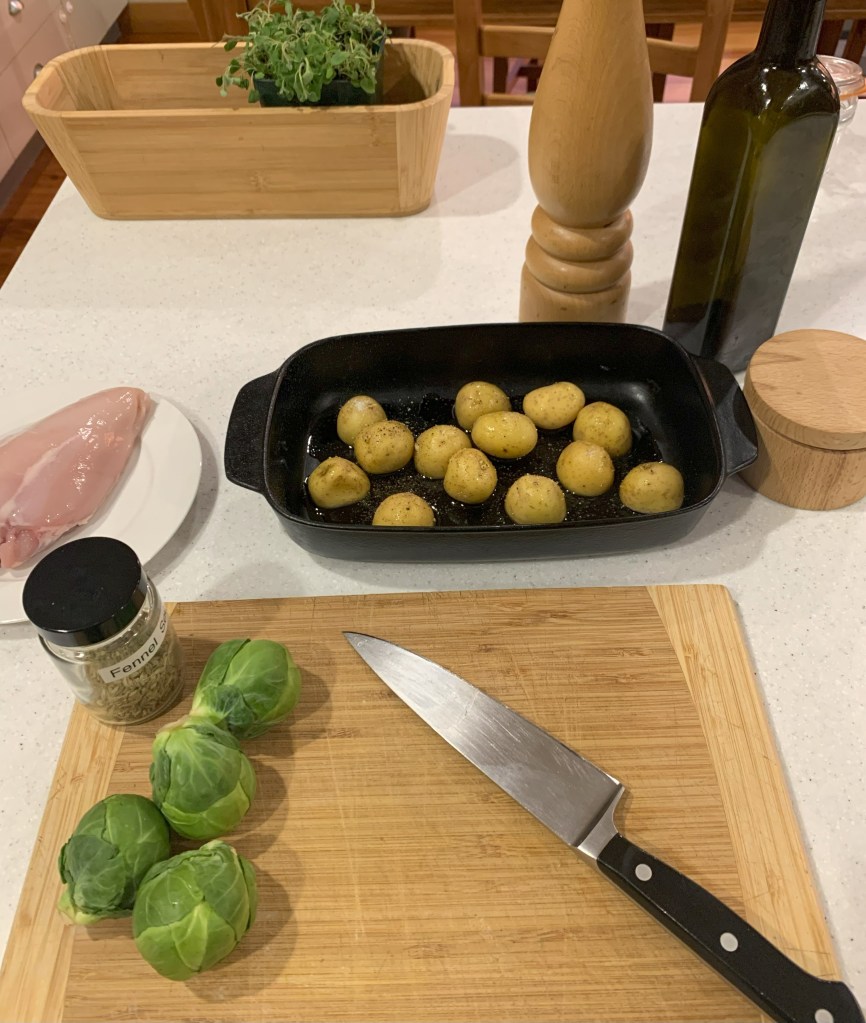 Chicken with savoy cabbage and roasted fennel seeds on p87 was also wonderful but I didn’t have savoy cabbage and I did have sprouts. They worked. I used chicken breast. Start by making a paste with roasted ground fennel seeds, salt and pepper and a tbsp olive oil. Rub the paste over the chicken and leave to marinate. Overnight would probably be good. Cook the chicken in a pan with a little oil then remove. In the same pan cook the thinly sliced cabbage or, in my case, sprouts for a few minutes until soft but not soggy. Add finely chopped garlic, a tsp roasted whole fennel seeds and black pepper and cook about a minute or less. Serve the chicken on top of the sprouts and dress with any pan juices.