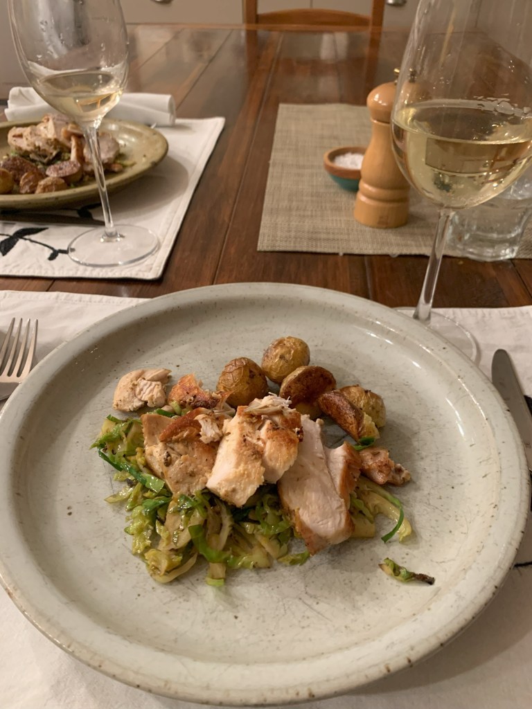 The recipe suggested serving with an apple and celeriac slaw, but I didn’t have celeriac and I did have Brussels sprouts, so I made I the warm Brussels sprouts, lemon and caper slaw on p 85.