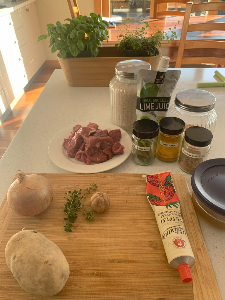 I have made khoresht e gheimeh p 181 before from the recipe in Saraban and it is a favourite because it uses dried limes. It is traditionally served with fried potatoes, which I have not done before. Traditionally this khoresht is made with yellow split peas and the potatoes are match sticked. The recipe in Taste of Persia uses black eyed beans, which I was going to try but I couldn’t find them anywhere. The Persia recipe also cubes the potatoes but I liked the look of the matchsticks, so I reverted to the Malouf recipe. Always a good one and the fried potatoes were such a great addition that I will do them again. I served it with the basic Persian rice and a tomato salad and herb plate.