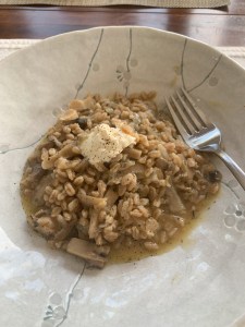 I tried an Armenian hajarov pilav p231 which is a cross between a mushroom pilaf and a risotto, using farro instead of rice. The book refers to farro as emmer wheat berries which confused me at first. It’s straightforward to make. Sauté chopped onion in butter, add sliced mushrooms and thyme, cooking until the mushrooms have started to soften. Add a cup of farro and 2 ½ cups stock and cook until the farro is tender. It will be soupy like a thick risotto and very flavourful. I drizzled with mint oil and served with yoghurt.